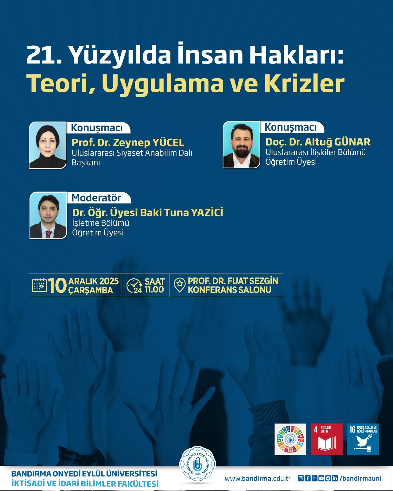 İktisadi ve İdari Bilimler Fakültemiz tarafından, “21. Yüzyılda İnsan Hakları: Teori, Uygulama ve Krizler” başlıklı konferans düzenlenecektir.