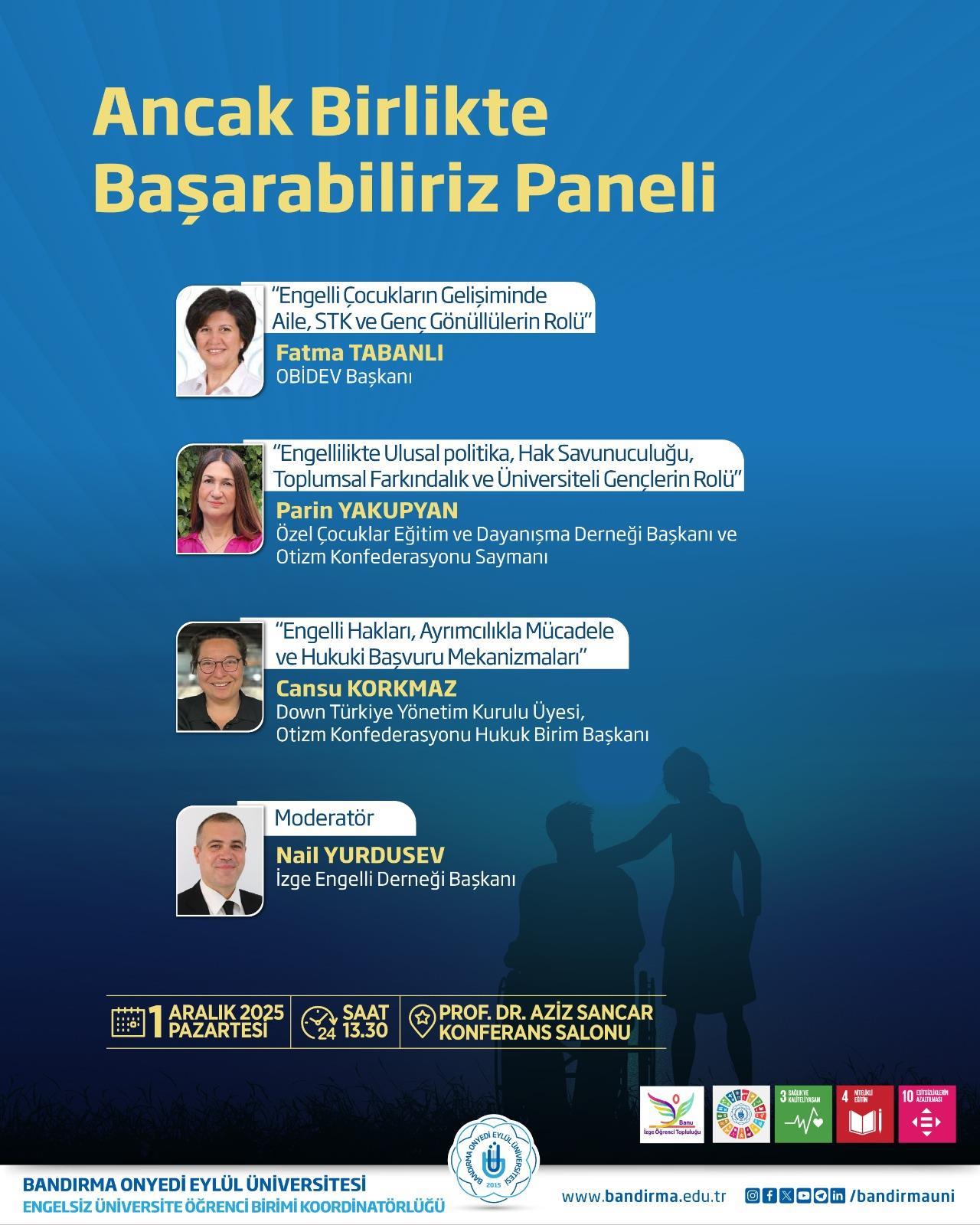 Engelsiz Üniversite Öğrenci Birimi Koordinatörlüğümüz tarafından, engelli bireylerin hakları, toplumsal farkındalık ve genç gönüllülerin rolüne dikkat çekmek amacıyla “Ancak Birlikte Başarabiliriz Paneli” düzenlenecektir.