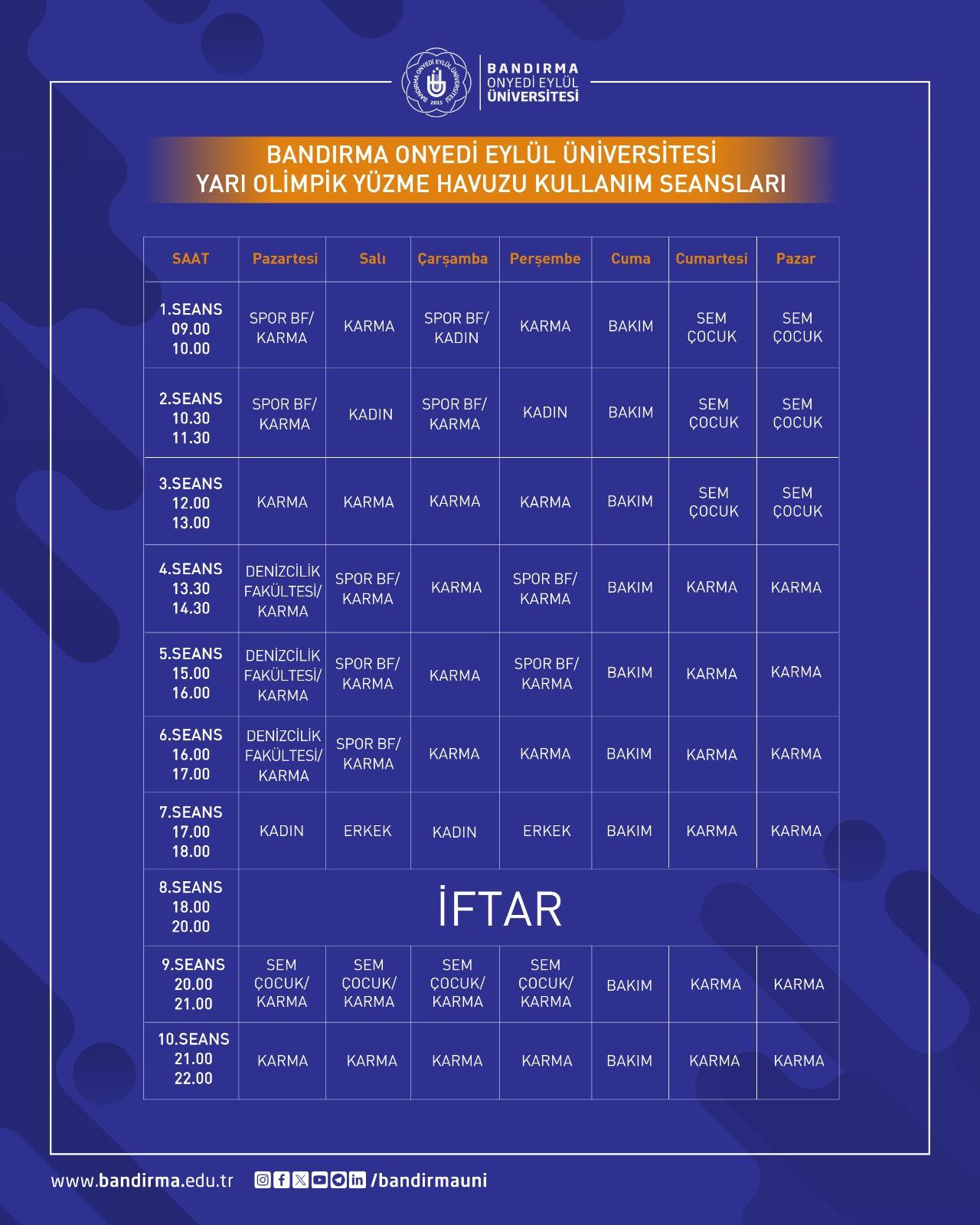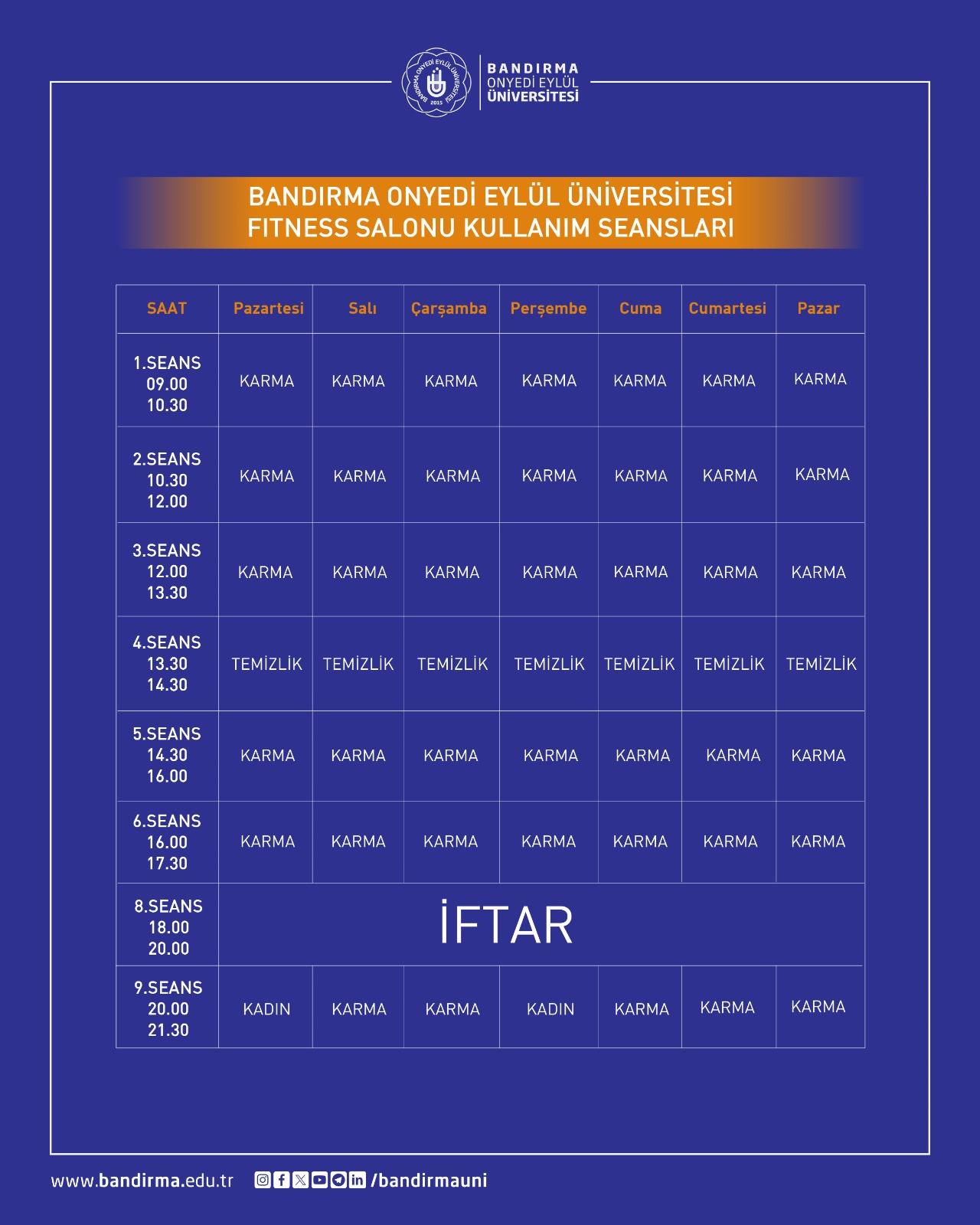 Bu kapsamda; Ramazan Ayı boyunca fitness salonu seansları saat 21.30’a, yüzme havuzu seansları ise saat 22.00’ye kadar uzatılmıştır. Yapılan düzenleme ile özellikle oruç tutan kullanıcılarımızın iftar sonrası spor faaliyetlerinden daha rahat yararlanabilmeleri amaçlanmıştır.