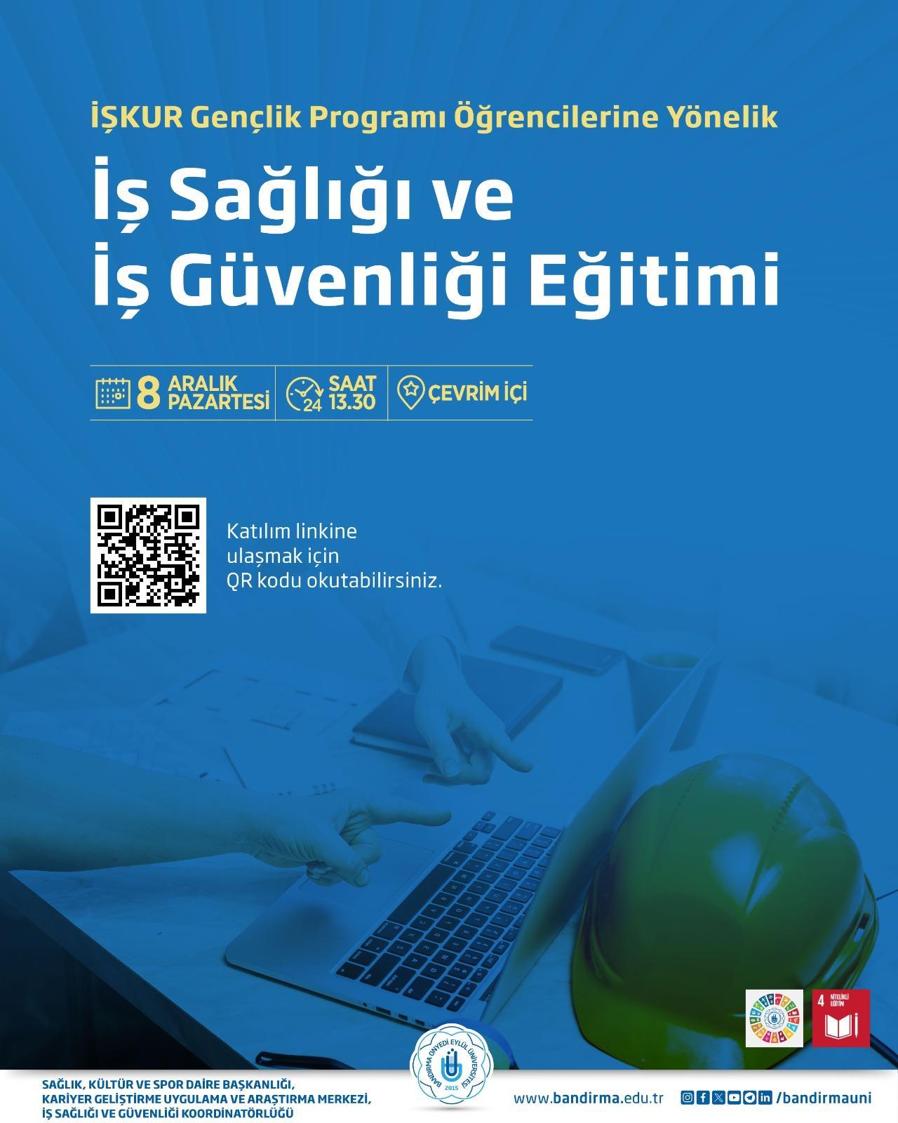 Sağlık, Kültür ve Spor Daire Başkanlığımız, Kariyer Geliştirme Uygulama ve Araştırma Merkezimiz ile İş Sağlığı ve Güvenliği Koordinatörlüğümüz iş birliğinde, İŞKUR Gençlik Programı öğrencilerine yönelik “İş Sağlığı ve İş Güvenliği Eğitimi” düzenlenecektir.