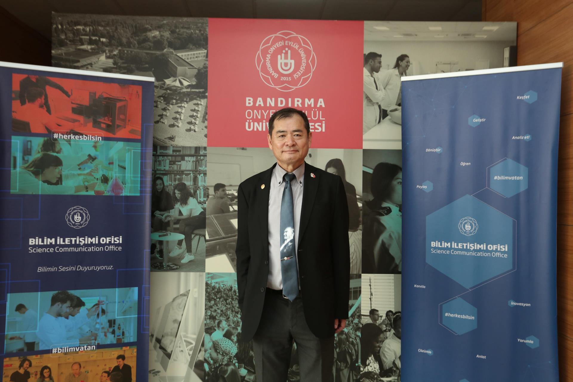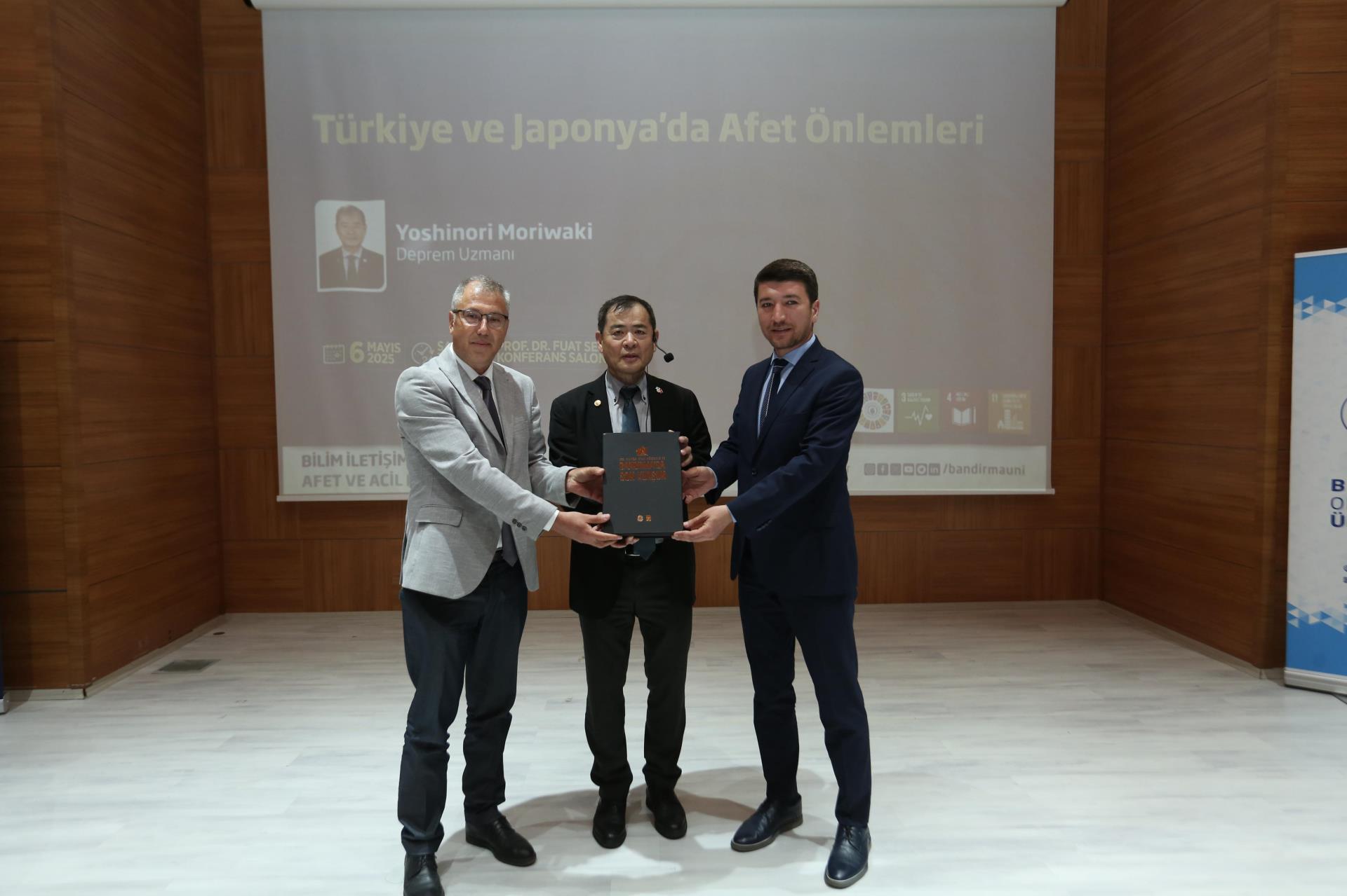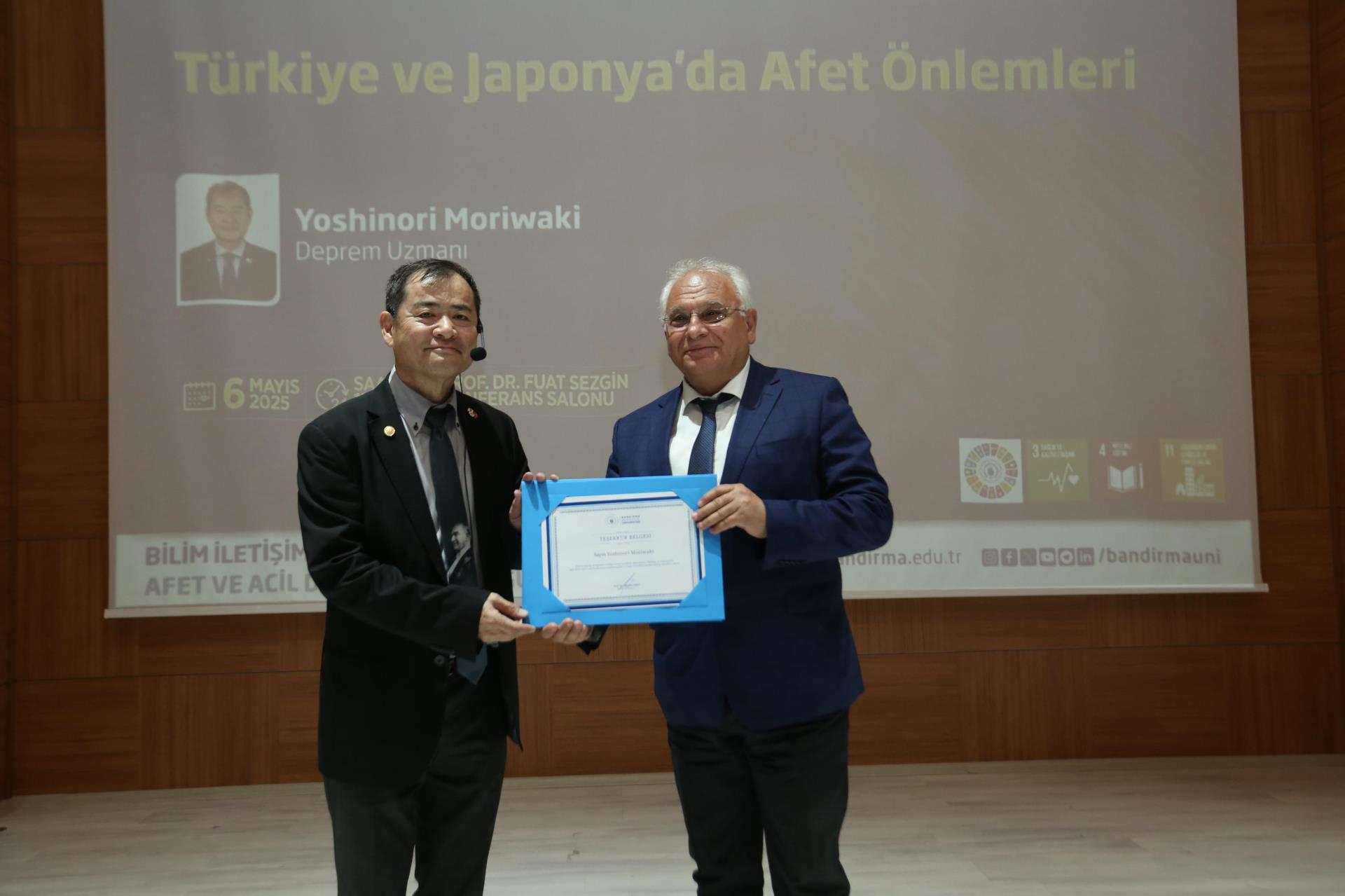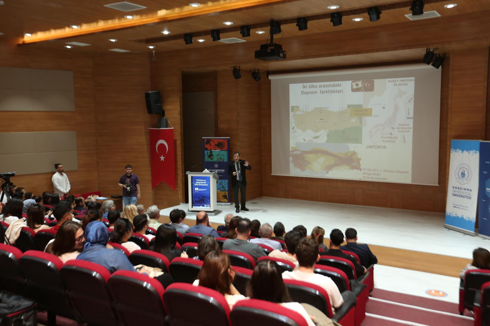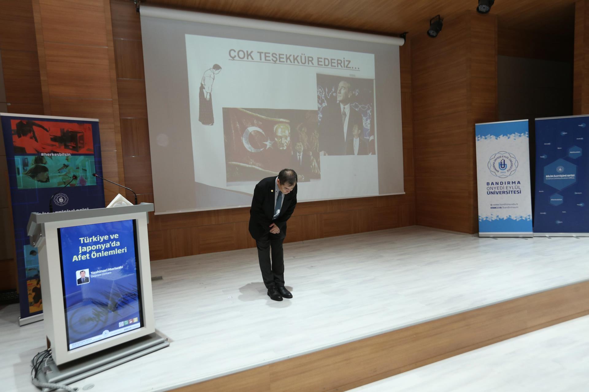 Saygı duruşunda bulunulması ve İstiklal Marşımızın okunmasının ardından, Yüksek Öğretim Kurulu (YÖK) Bilim İletişim Projesi için özel olarak hazırlanan tanıtım filmi izleyicilere sunuldu. Ardından söz alan Yoshinori Moriwaki, 1990 yılında ilk kez Türkiye’ye geldiğini ve 35 yıldır burada yaşadığını ifade ederek, Japonya’daki inşaat mühendislerinin jeoloji ve jeofizik eğitimi alıp ayrıca bu alanda ayrıca sınava tabi tutulduklarından bahsetti. Konuşmasında iki ülke arasında yaşanan depremlerin sonuçlarını karşılaştıran Moriwaki, Japonya’da aynı şiddetteki depremlerin daha az can kaybına neden olduğunu belirtti. “Ben Türkiye için çalışmak istiyorum” ifadesiyle, Türkiye’deki deprem bilincinin gelişmesi adına duyduğu sorumluluğu vurgulayan Moriwaki, Bandırma’yı da etkileyen Kuzey Anadolu Fay Hattı hakkında önemli bilgiler paylaştı.
