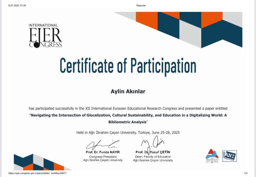 Bu kapsamda, Öğretim Üyemiz 25–28 Haziran 2025 tarihleri arasında Ağrı İbrahim Çeçen Üniversitesi ev sahipliğinde gerçekleştirilen 12. Uluslararası Avrasya Eğitim Araştırmaları Kongresi (EJERCongress)’e çevrim içi olarak katılım sağlayarak; bir tane İngilizce bildiri sunmuştur ve bir tane oturum başkanlığı yapmıştır.