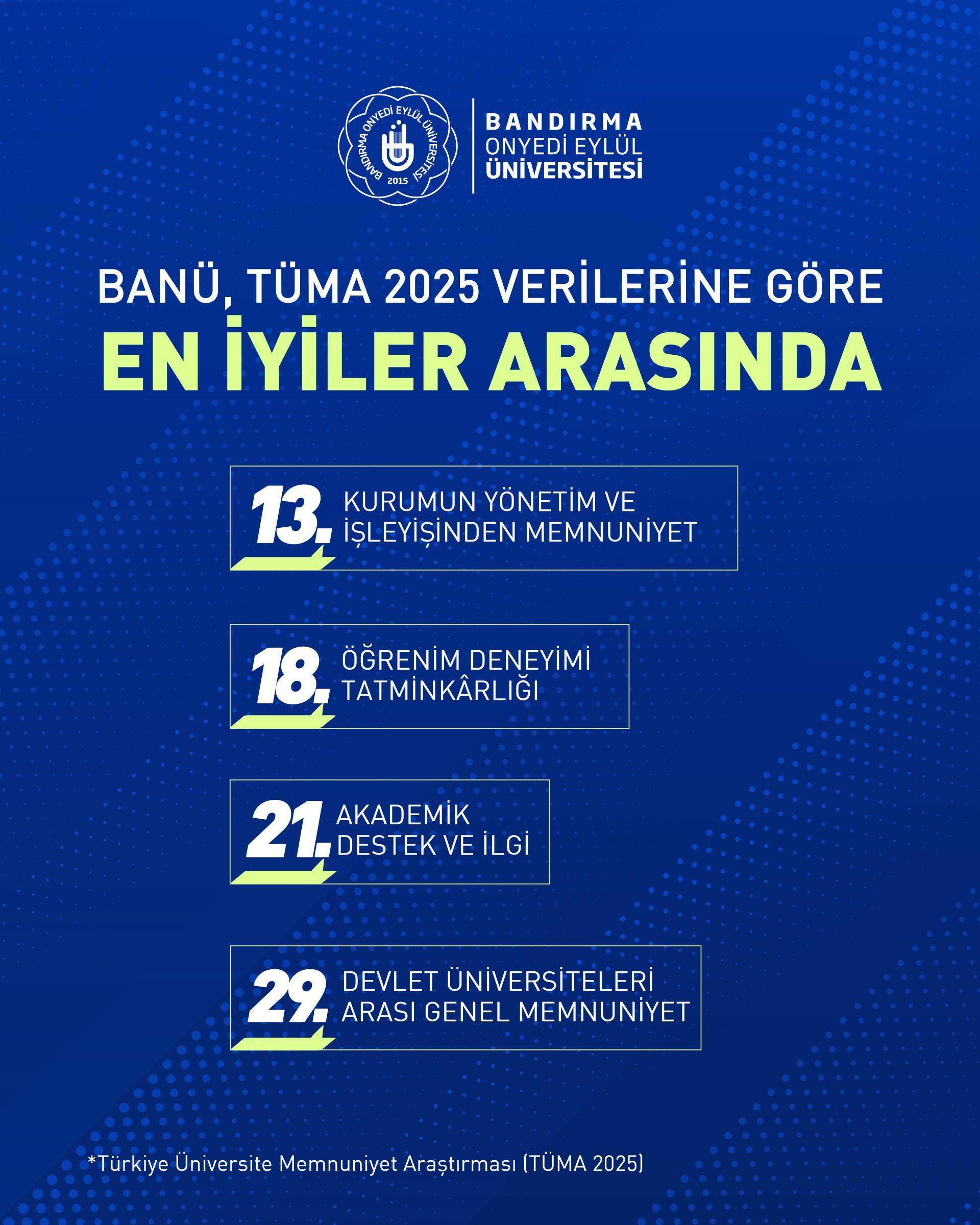 Bandırma Onyedi Eylül Üniversitesi, her yıl olduğu gibi bu yıl da Türkiye Üniversite Memnuniyet Araştırması (TÜMA 2025) sonuçlarına göre devlet üniversiteleri arasında en iyiler arasındaki yerini aldı.