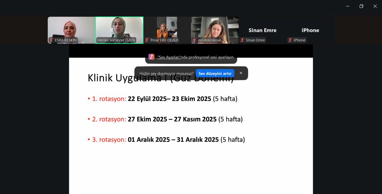 An online information meeting was held with the institutions and supervisors working in the institutions where our students will practice on September 19, 2025, within the scope of the Clinical Practice-I course in the Fall Semester of the 2025-2026 Academic Year. The meeting, organized under the leadership of our department's Clinical Practice Course Committee members Dear Assist. Prof. Dr. Melike Sümeyye ÖZEN and Dear Assist. Prof. Dr. Esra KESKİN, was attended by faculty members from our department, owners of institutions where our students will practice, and physiotherapists. At the information meeting, institutions were informed about the dates on which our students will practice in the fall semester, rotation groups, forms and documents that students must prepare, schedules that supervisors must follow, and exams. After gathering feedback from participants on past semesters, we listened to their expectations for this upcoming semester. The meeting concluded with the hope of a productive clinical practice semester. We thank everyone who participated.