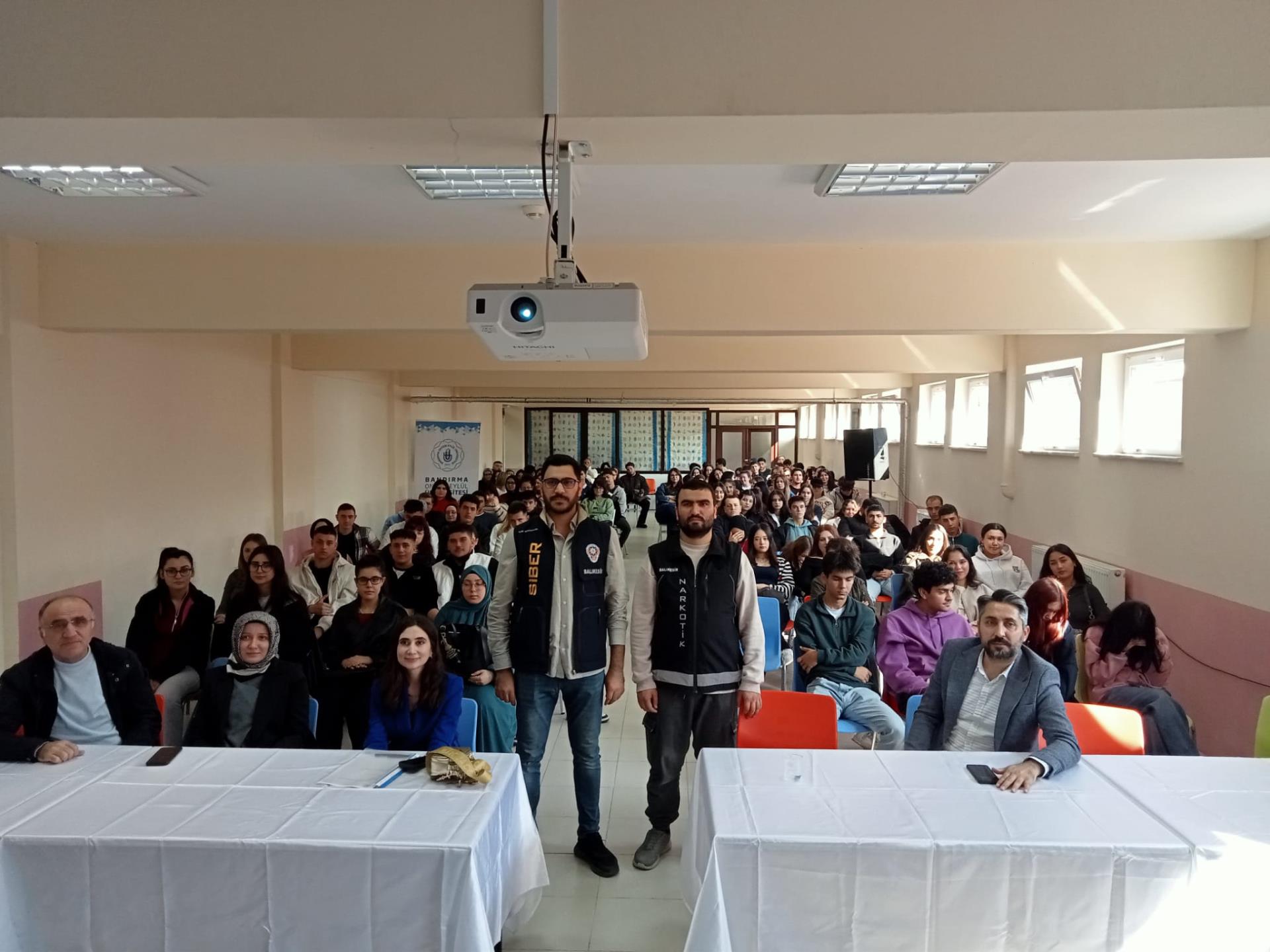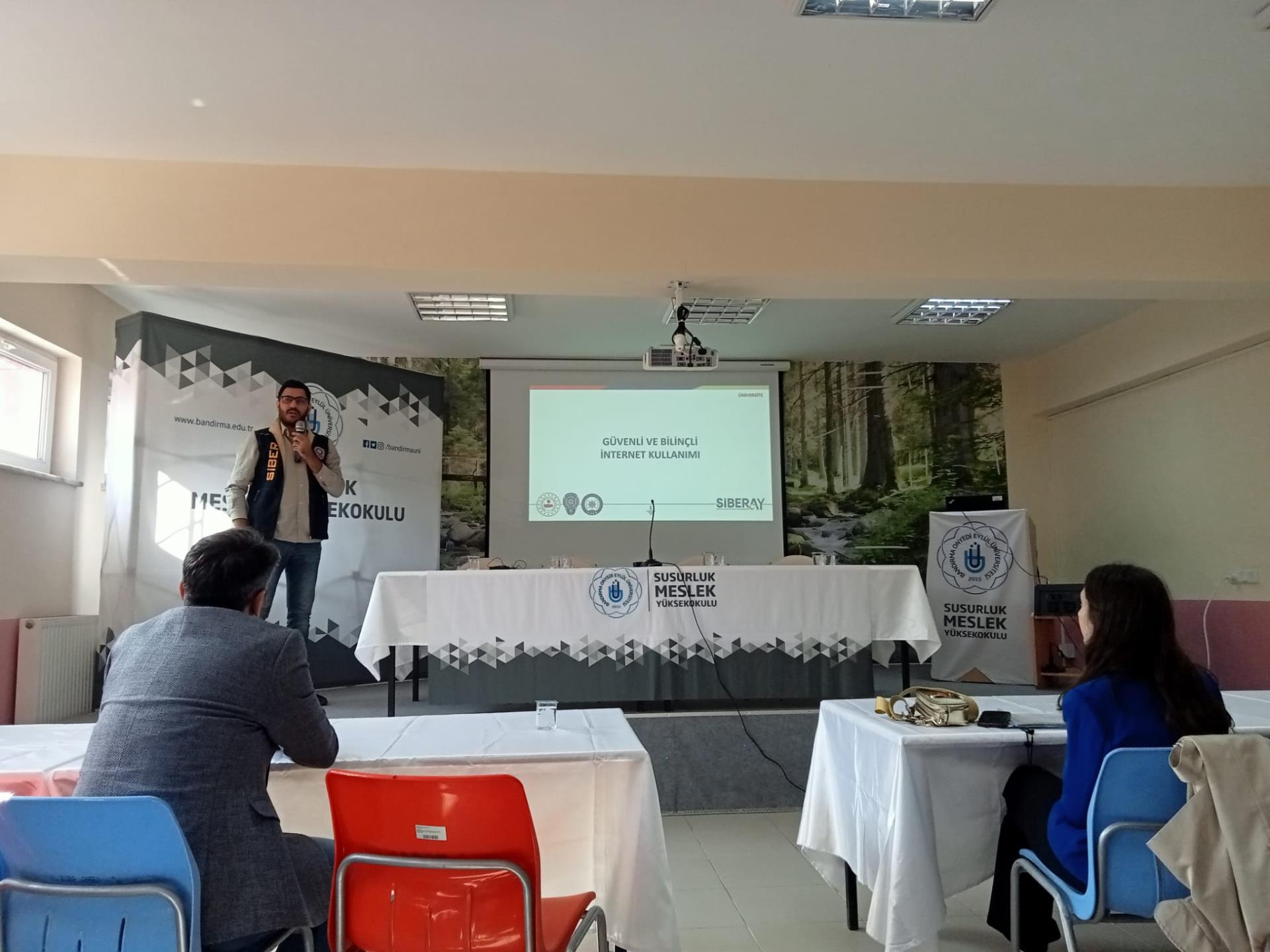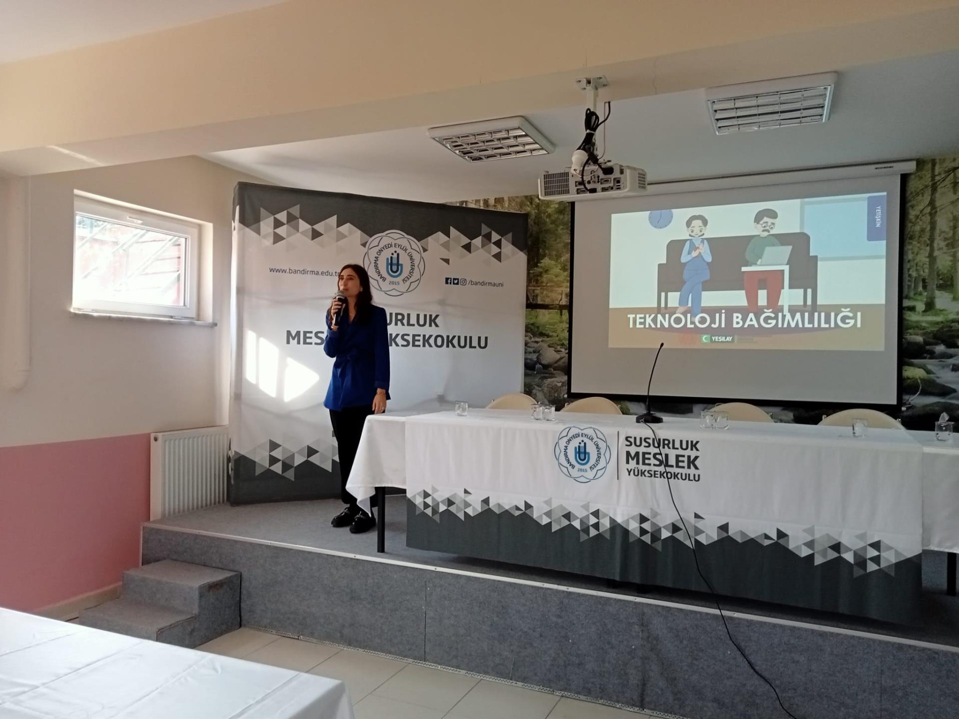 Yüksekokulumuzda Bandırma Onyedi Eylül Üniversitesi PDR Birimi Psikolog Mehmet KARABATAN, Balıkesir Sosyal Hizmetler Müdürlüğü sosyolog Seda Selin GÖK ve İlçe Emniyet Müdürlüğü Devran SEFEROĞLU tarafından Bağımlılık ( Siberay, sanal bahis, kumar bağımlılığı) ile ilgili öğrencilerimize konferans verildi.