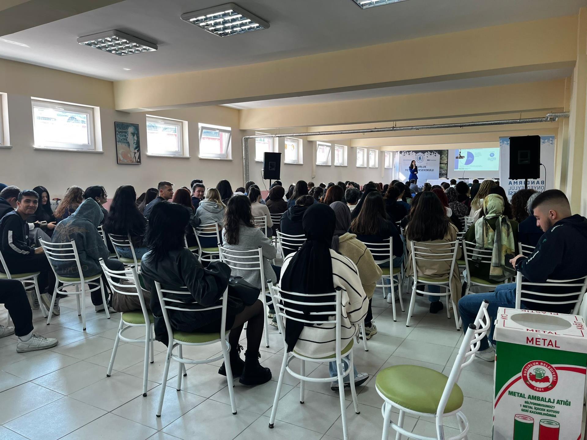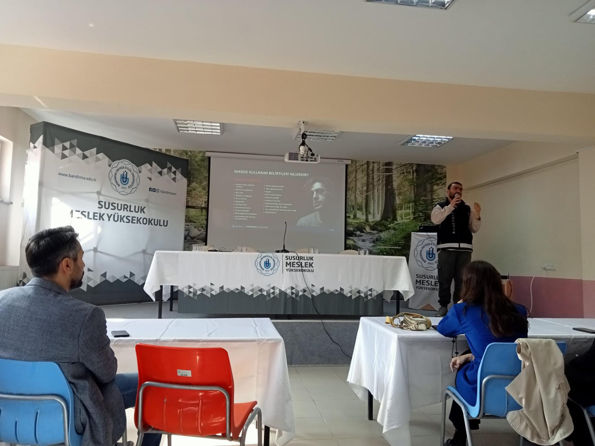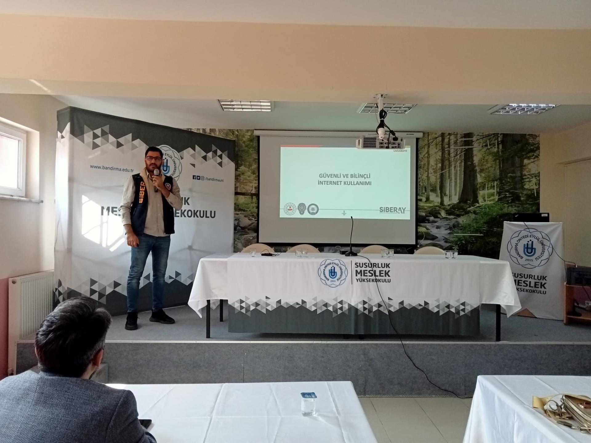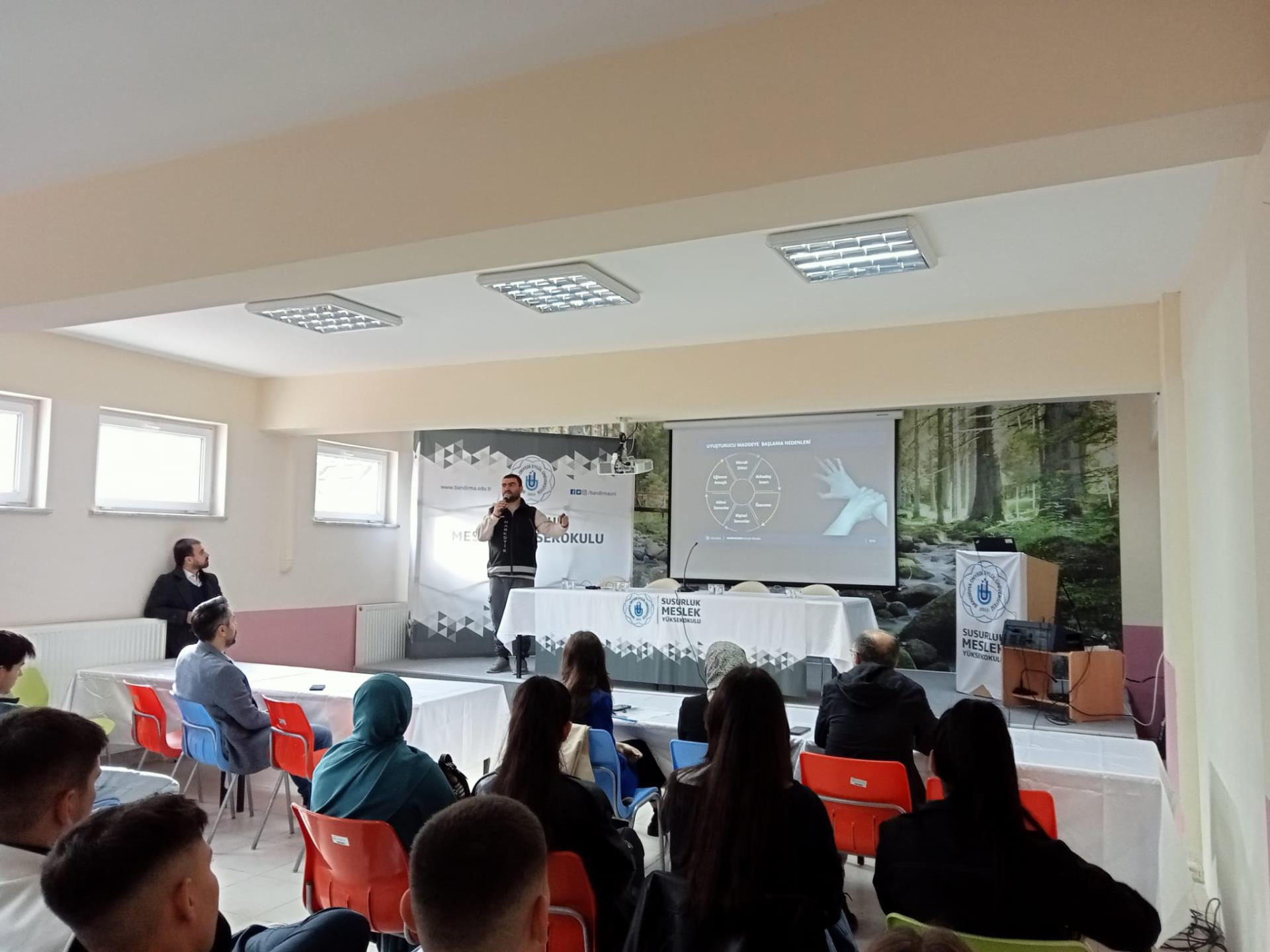 Yüksekokulumuzda Bandırma Onyedi Eylül Üniversitesi PDR Birimi Psikolog Mehmet KARABATAN, Balıkesir Sosyal Hizmetler Müdürlüğü sosyolog Seda Selin GÖK ve İlçe Emniyet Müdürlüğü Devran SEFEROĞLU tarafından Bağımlılık ( Siberay, sanal bahis, kumar bağımlılığı) ile ilgili öğrencilerimize konferans verildi.