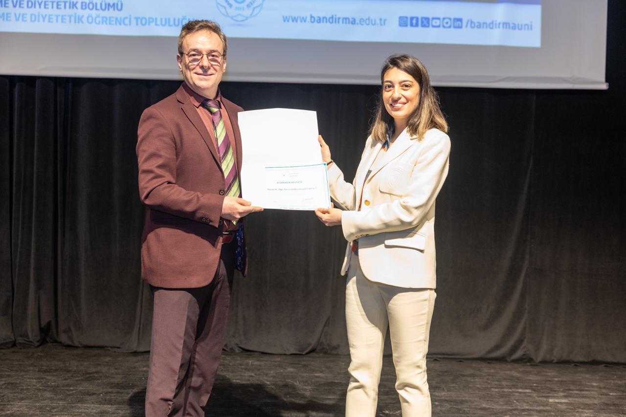 Etkinlik sonunda Beslenme ve Diyetetik Bölüm Başkanımız Prof. Dr. Uğur Günşen tarafından Dr. Öğr. Üyesi Kübra Damla Ekenci’ye teşekkür belgesi takdim edildi. Program, günün anısına çekilen hatıra fotoğrafının ardından sona erdi.