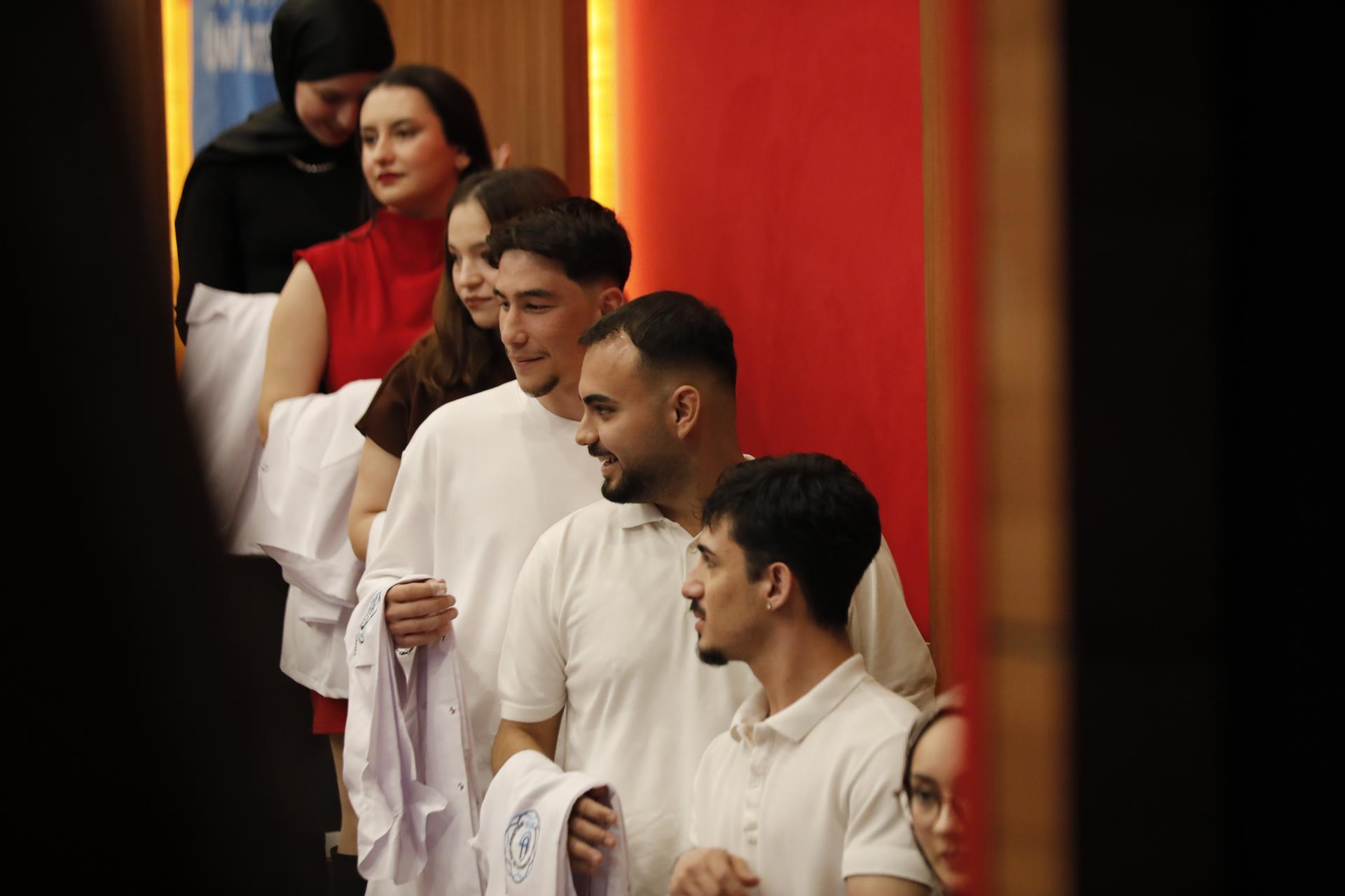 Programın devamında genel sekreterimiz, dekanlarımız, öğretim üyelerimiz tarafından Fizyoterapi ve Rehabilitasyon Bölümü öğrencilerimize beyaz önlükleri giydirildi. Mesleğe ilk adımı simgeleyen bu anlamlı anlar, öğrencilerimiz ve aileleri tarafından gurur ve heyecanla karşılandı. Tören, günün anısına gerçekleştirilen toplu fotoğraf çekimi ile sona erdi.