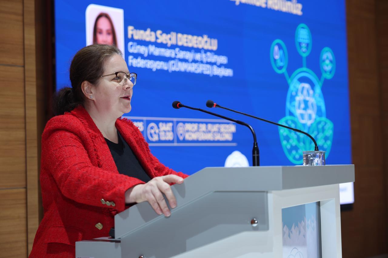 Söyleşinin konuşmacısı, Güney Marmara Sanayi ve İş Dünyası Federasyonu (GÜNMARSİFED) Başkanı Funda Seçil Dedeoğlu oldu. Dedeoğlu, konuşmasında dijital dönüşüm, sürdürülebilirlik ve sosyal etki başlıkları çerçevesinde iş dünyasının beklentilerini aktararak, gençlerin bu dönüşüm süreçlerinde aktif rol almalarının gerekliliğine dikkat çekti.