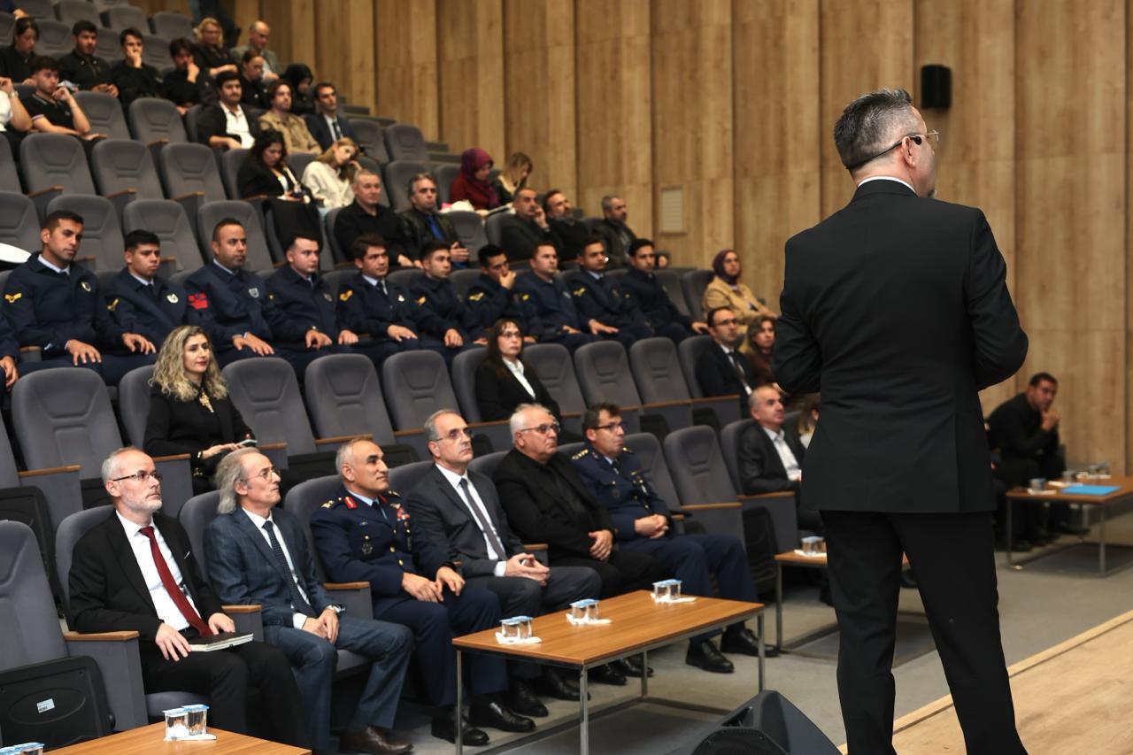 Prof. Dr. Aziz Sancar Konferans Salonu’nda gerçekleştirilen programa; 6. Ana Jet Üs ve Garnizon Komutanı Hava Pilot Tuğgeneral Esat Çetin, Rektörümüz Prof. Dr. İsmail Boz, Rektör Yardımcımız Prof. Dr. Alpaslan Serel, Genel Sekreterimiz Faruk Küçük, akademik ve idari personelimiz ile öğrencilerimiz katıldı.