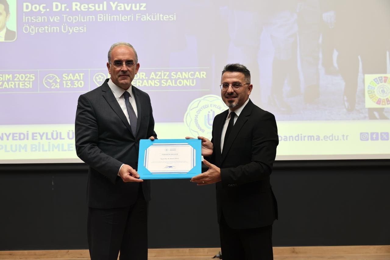 Konferansın sonunda Rektörümüz Prof. Dr. İsmail Boz, katkılarından dolayı Doç. Dr. Resul Yavuz’a teşekkür belgesi takdim etti. Etkinlik, günün anısına çekilen toplu hatıra fotoğrafıyla sona erdi.