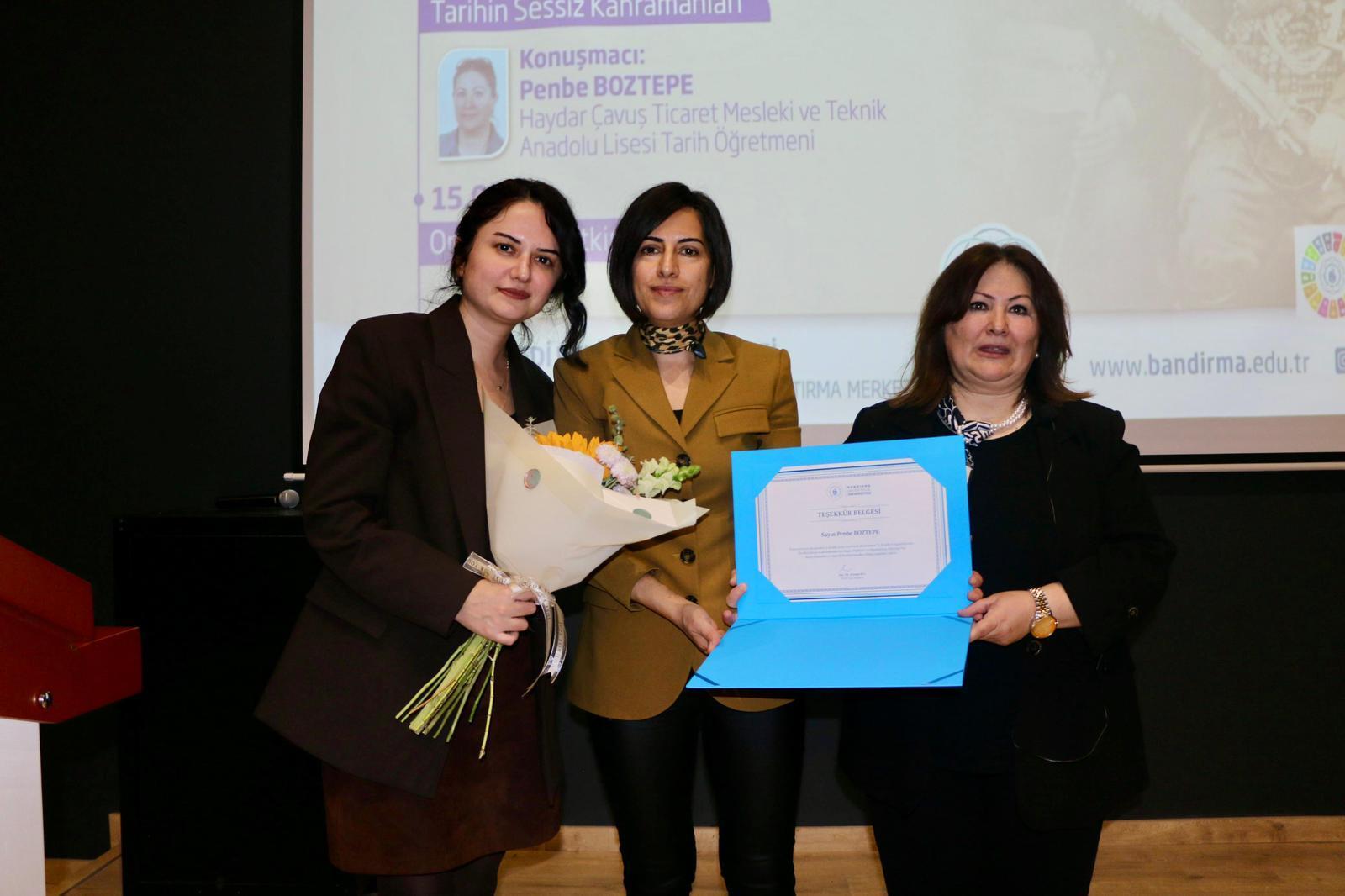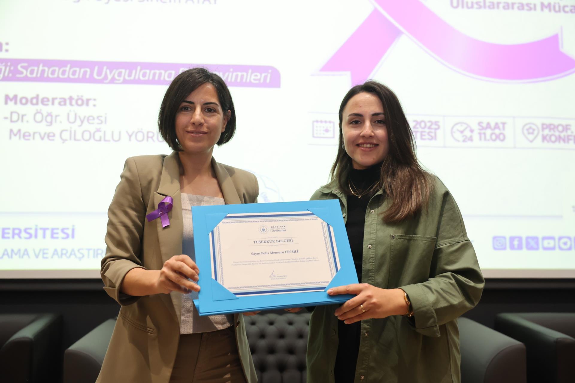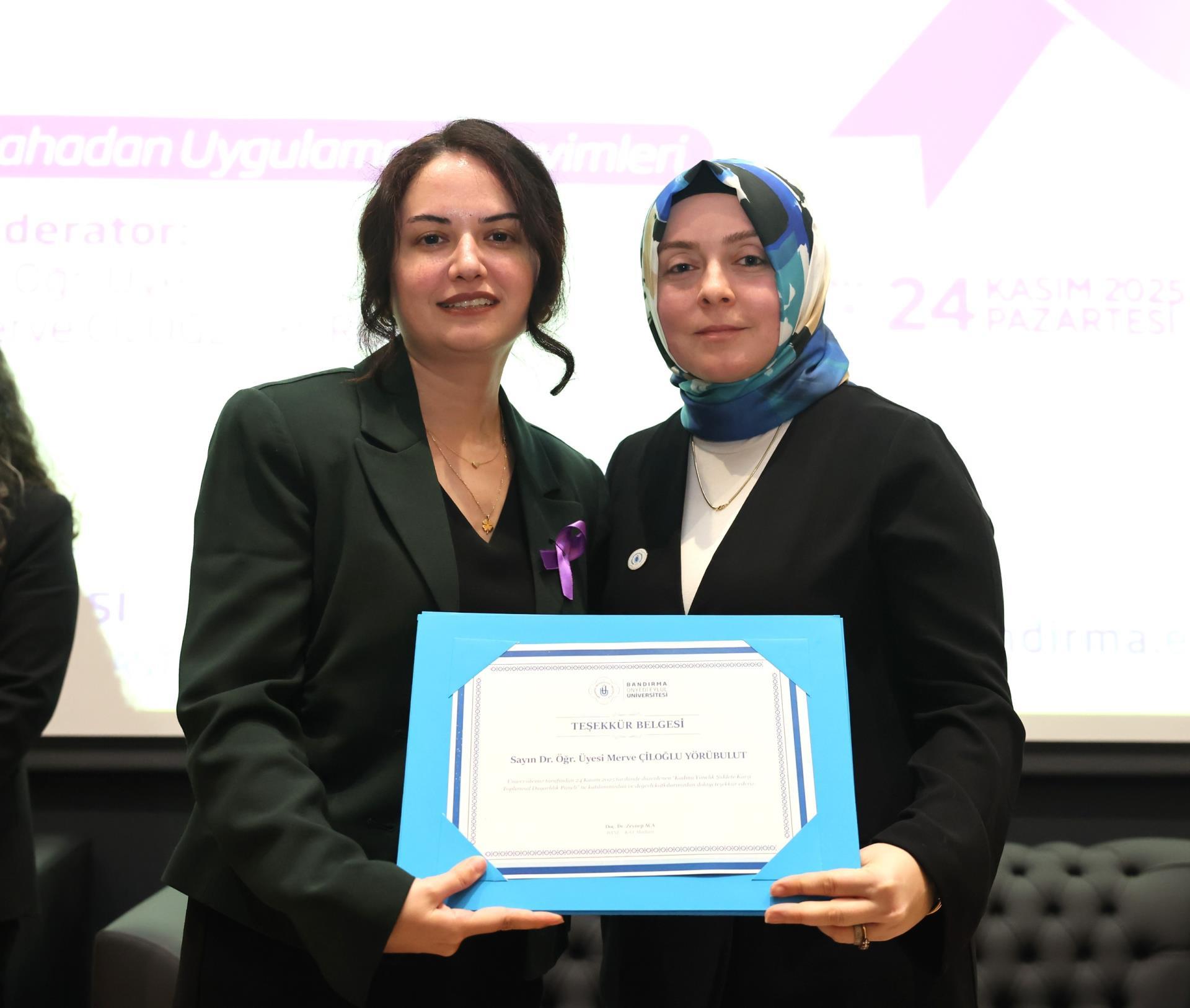 “Koruma, Müdahale ve İşbirliği: Sahadan Uygulama Deneyimleri” başlıklı ikinci oturumda ise Sosyal Hizmet Uzmanı Ayşen Gündüz ile Bandırma İlçe Emniyet Müdürlüğü’nde görev yapan Başkomiser Hilal Sert, polis memurları Nejla Yıldırım Çulha ve Elif Sili sahadaki uygulama deneyimlerini aktardı. Moderatörlüğü Dr. Öğr. Üyesi Merve Çiloğlu Yörübulut’un üstlendiği oturum, dinleyicilerin soruları ve katkılarıyla etkileşimli bir şekilde ilerledi. Oturum sonunda Prof. Dr. Recep Yıldız, Doç. Dr. Zeynep Aca ve Dr. Öğr. Üyesi Gizem Burcu Karaali tarafından katılımcılara teşekkür belgeleri sunuldu.