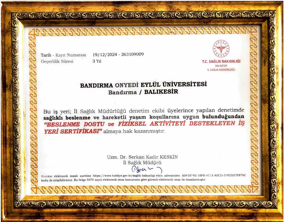 Üniversitemiz, T.C. Sağlık Bakanlığı Halk Sağlığı Genel Müdürlüğü tarafından hazırlanan “Beslenme Dostu ve Fiziksel Aktiviteyi Destekleyen İş Yeri Uygulama Rehberi” doğrultusunda Sağlık, Kültür ve Spor Daire Başkanlığımızca yürütülen çalışmalar kapsamında, kurumumuz önemli bir başarıya imza attı.