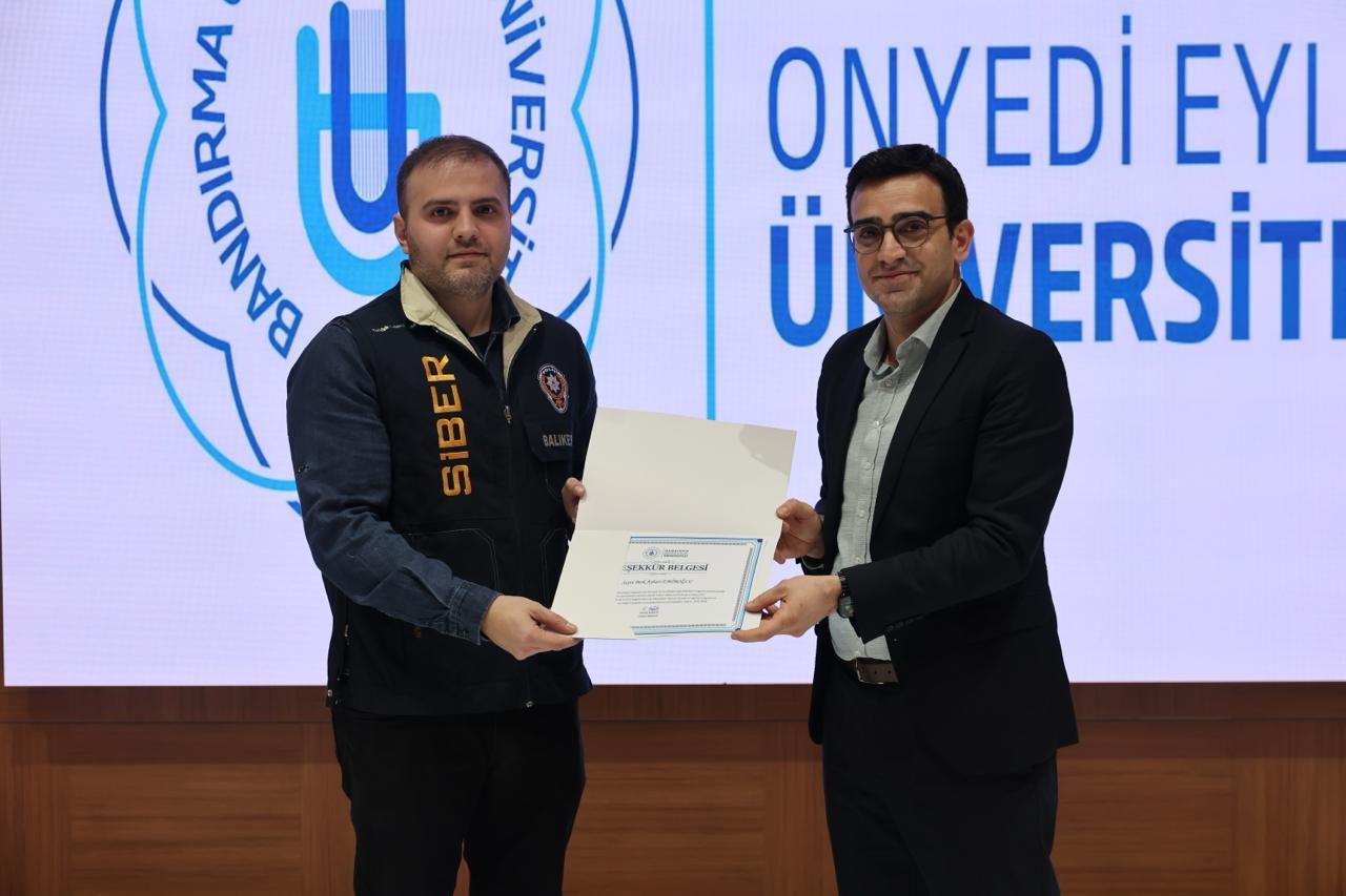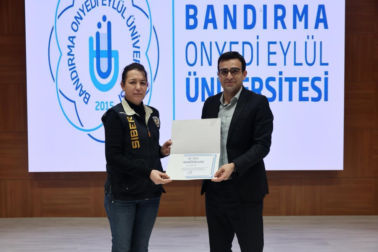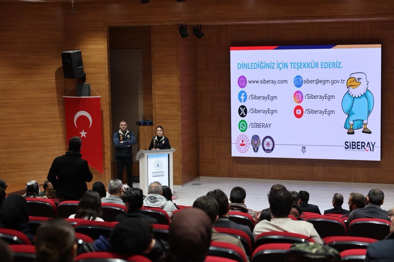 Program kapsamında Balıkesir Emniyet Müdürlüğü SİBERAY biriminde görevli uzmanlar Fatma Yiğit ve Berk Aybars Emiroğlu tarafından internet üzerinden gerçekleştirilen dolandırıcılık yöntemleri, yasa dışı bahis sitelerinin kullanım biçimleri ve son dönemde artış gösteren IBAN bilgilerinin kiralanması gibi siber suç yöntemleri hakkında bilgilendirme yapıldı. Katılımcılara bu tür suçlara karşı alınabilecek bireysel önlemler ve yasal süreçler hakkında da önemli bilgiler aktarıldı.